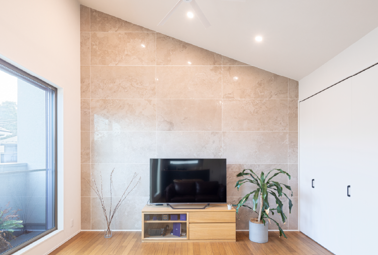 「明るい家」にしたいというご要望に応え、採光を考慮したこだわりの明るい家に。外観は四角を上手に利用した、囲まれているようなデザインにしました。南側に大きな開口を設けることで、LDK内にはたっぷり日差し が降り注ぎ、勾配天井の開放感あふれるリビングは、天井まで貼った大判のタイルが印象的。ご夫婦の求めていた「明るい住まい」を実現しました。