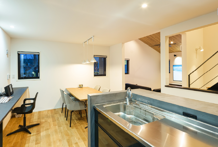 インナーガレージや家事動線を重視した間取りが魅力です。キッチンを中心にお料理しながらでも家族と繋がる。そんなカタチを具現化しました。家づくりの参考書のようなモデルハウスに仕上がりました。